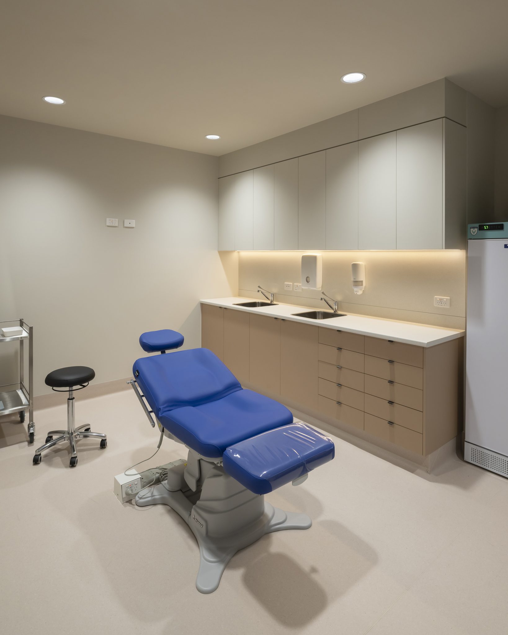 - Consultation + Treatment Rooms: Designed for clinical performance, these areas feature practical finishes such as coved vinyl, integrated handwash stations, and joinery. Warm timber finishes and discreet black hardware ensure continuity of aesthetic while supporting the functionality required in healthcare settings.